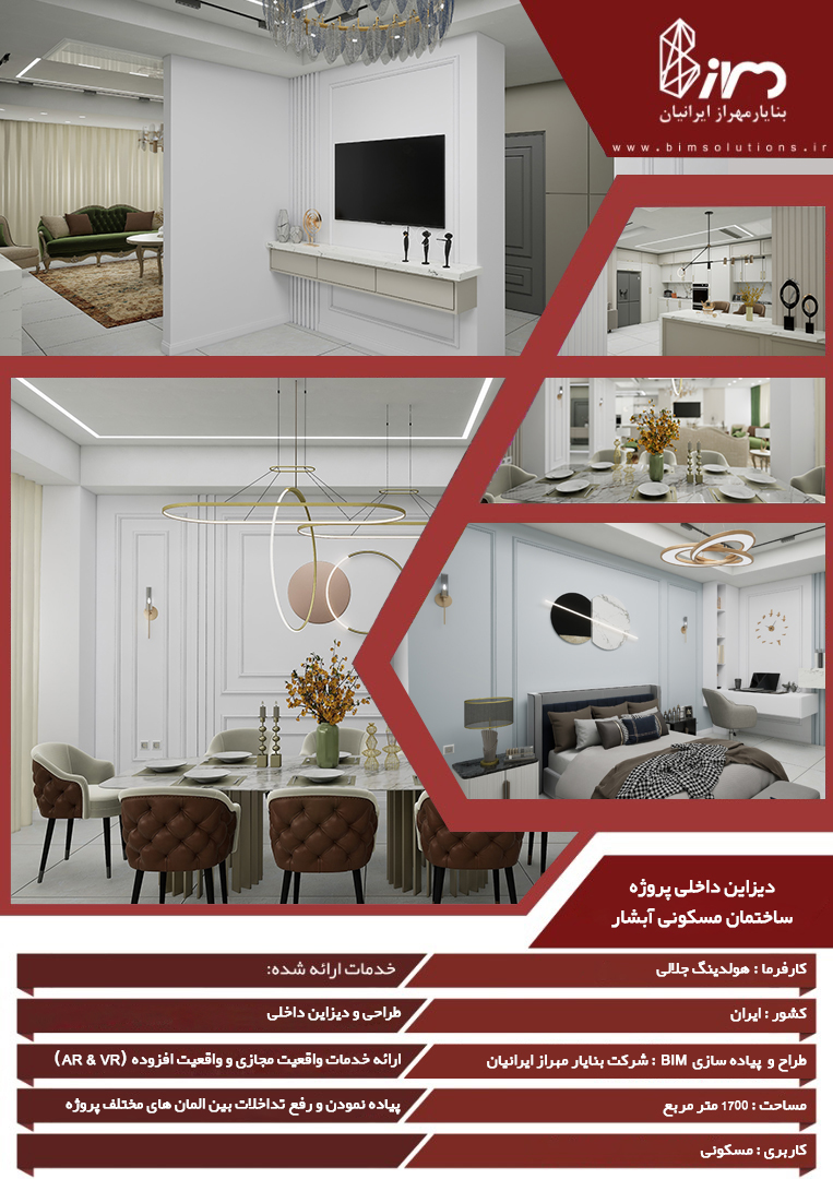 پروژه مسکونی آبشار در منطقه چمران، یکی از نمونههای کامل ادغام طراحی داخلی، مدلسازی اطلاعات ساخت (BIM) و خدمات واقعیت مجازی است؛ پروژهای که در آن تمام اجزای معماری، سازه، تأسیسات و جزئیات دکوراسیون داخلی در قالب یک مدل یکپارچه و قابل اجرا توسعه یافت.